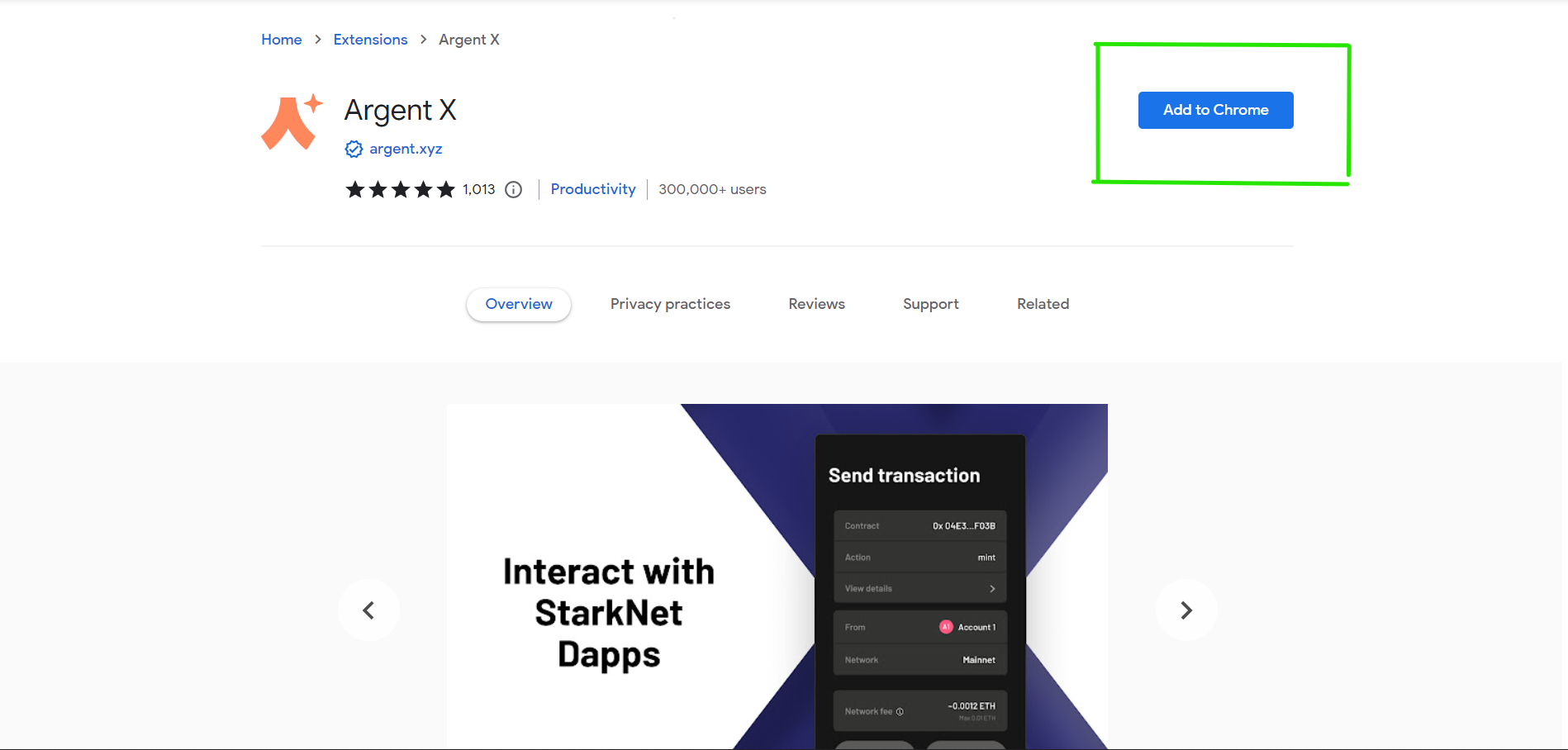 **Step 1**: Download Argent X [browser extension](https://chrome.google.com/webstore/detail/argent-x/dlcobpjiigpikoobohmabehhmhfoodbb)